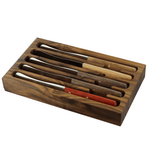 Hochwertige Modelle kommen aus rostfreiem Stahl. Die Griffe sind ergonomisch geformt und aus Echt-Holz (Kirsche, Buche, Walnuss, Olive, Padouk, Räuchereiche) aus unserer hauseigenen Schreinerei. Natürlich nachhaltig!